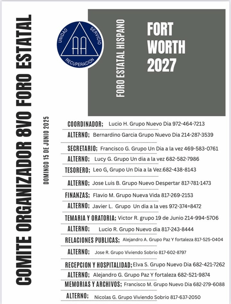 | EL COMUNICATIVO BOLETIN #66 PERIODO 24-25 AGOSTO/17/25 “La Novena Tradición establece que A.A. como un todo nunca debe organizarse, pero sí pueden crearse comités de servicio responsables ante la comunidad.” OFICINA INTERGRUPAL HISPANA DE ALCOHOLICOS ANONIMOS 3244 W. SEMINARY DR. SUITE B FORT WORTH TEXAS 76133. WEBSITE; aaftworthhispano.wordpreess.com EMAIL;alcoholicosanonimosfw@gmail.com FACEBOOK; ALCOHOLICOS ANONIMOS FW REUNIONES; 1er y3er DOMINGO DE CADA MES DE 9;00AM EN ADELANTE TEL;(817) 921-6882 SE ATIENDE LAS 24 HRS. 24/7 OFICINA INTERGRUPAL HISPANA DE AA 3244 W SEMINARY DR SUITE B FORT WORTH TX 76133 (817) 921-6882 PAGINA DE WEBB www.alcohlicosanonimoshispanofw.net correo electronico oficina.intergrupal@yahoo.com |